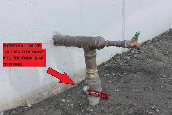 - If home is equipped with “Ball Valve” type valve, turn handle clockwise one ¼ turn. Handle should be perpendicular with piping when closed.