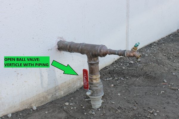 - Ball Valve, turn handle clockwise one ¼ turn. Handle should be perpendicular with piping when closed.